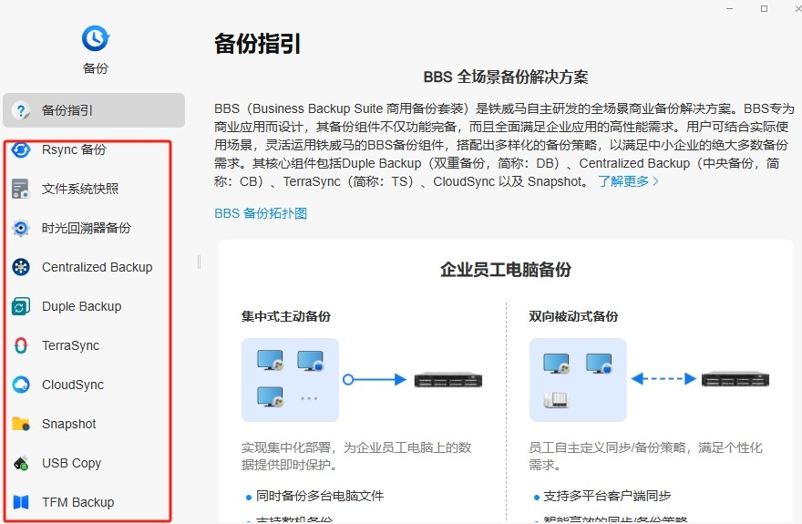 铁威马TOS系统打造的智能防护体系,让数据安全从被动防守转向主动防御。铁威马提供BBS全场景备份解决方案,其中,双重备份实现铁威马备份服务器中的数据异地容灾备份;中央备份将企业内部员工电脑、文件服务器、虚拟机等数据集中备份到本地的铁威马备份服务器中;TerraSync能实现多台备份服务器之间、备份服务器与电脑间的数据同步等。齐全的备份工具给足安全感,让人直呼“备份,就选铁威马”。