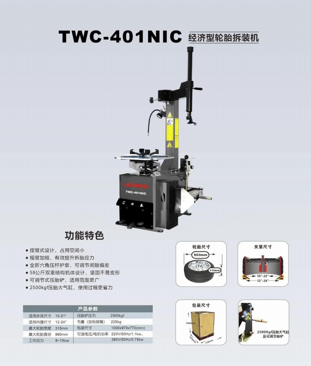 从产品参数来看,TWC - 401NIC 同样表现出色。适用的外夹尺寸为 10 - 21 英寸,内撑尺寸为 12 - 24 英寸,最大轮胎宽度达 315mm,最大轮胎直径为 960mm,这样的尺寸范围几乎涵盖了市面上绝大多数车型的轮胎规格。工作压力在 6 - 10bar 之间,可适应不同的轮胎拆装工况。