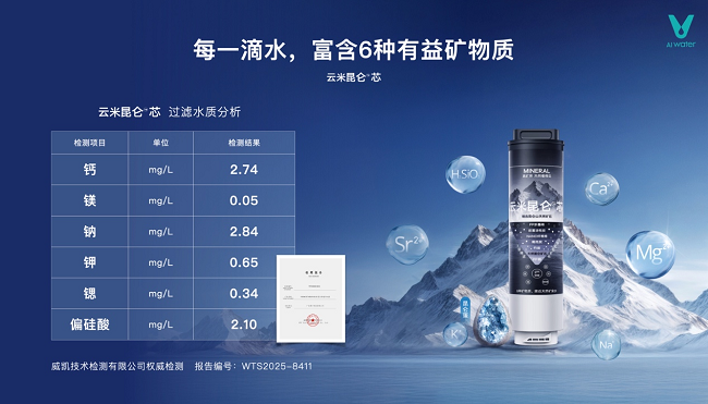 教授级高级工程师冯惠敏先生表示,云米昆仑4矿泉净水器所采用的昆仑石,富含6种矿物质,尤其是锶和偏硅酸。云米运用AI技术,模仿矿泉水的形成过程,使矿物质能缓慢长期释放,经其过滤的水,接近天然矿泉水,为用户带来健康优质的饮水体验。