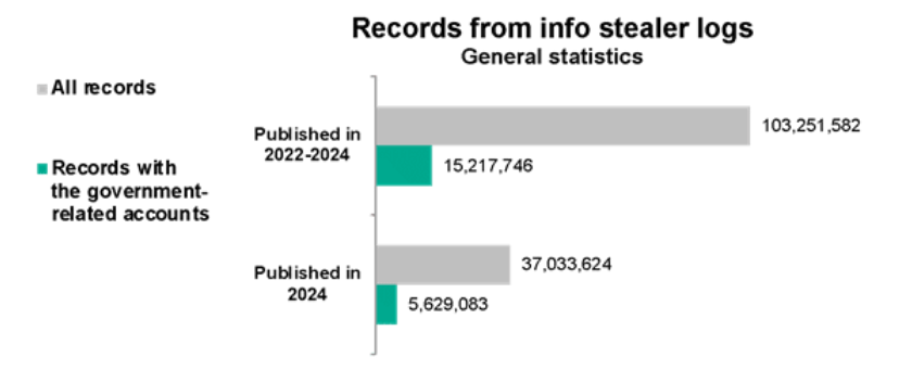 窃取数据的恶意软件活动:2024年,攻击者公开的恶意软件日志文件中发现了与巴西服务和资源相关的3700万条用户账户泄露记录,这一数字令人震惊。其中15%的记录——即2024年泄露的560万条以及过去三年累计超1500万条——涉及巴西主要政府机构员工的账户,或用于访问公民和企业政府服务的凭证。