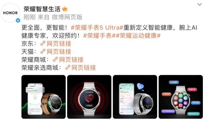 目前,荣耀手表5 Ultra已开启预约,消费者可通过京东、天猫等平台抢先预约,还有机会尊享多重首发专属权益(具体权益请关注各平台预约页面)。一起开启预约的还有MagicBook Art 14、MagicPad 3、荣耀Earbuds开放式耳机等荣耀“AI全家桶”新品,荣耀Magic V5开启预定。