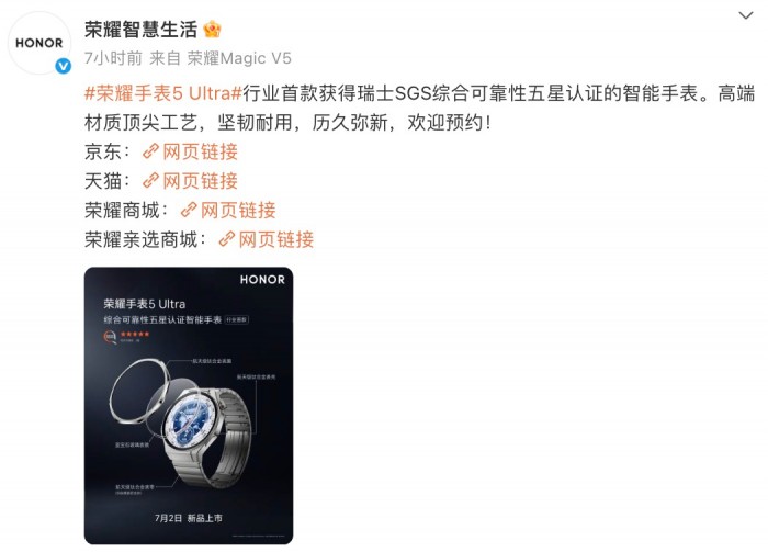 6月27日,荣耀官方微博发布荣耀手表5 Ultra系列产品海报。荣耀手表5 Ultra以航天级钛合金表圈、表壳和蓝宝石玻璃抗刮表镜,成为行业首款获得瑞士SGS综合可靠性五星认证的智能手表。同时,荣耀手表5 Ultra在AI智慧能力、运动健康功能方面也表现突出,在官方发布的海报中,就展示了其YOYO智慧助手、45秒耀体检健康报告、运动健康等场景。