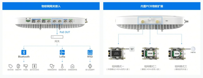 RG-APD4930支持开放兼容的外置PoE物联网扩展和内置PCIE插卡方式,打破了以往物联网厂商绑定、接入协议及形态单一的局限。