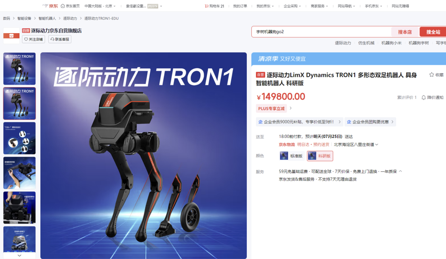据了解,逐际动力LimX Dynamics TRON1多形态双足机器人自发布以来,就凭借创新的双轮足设计和卓越的多地形移动能力,获得了国内外知名高校和科技企业的广泛采用。该产品近期推出的移动操作、感知拓展和语音交互三大功能套件,进一步扩展了在巡检、安防、配送等领域的应用场景。该产品的标准版和科研版正在京东热销中,售价分别为79800元和149800元,满足了不同用户群体的需求。