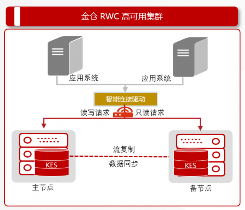 金仓数据库读写分离集群采用内网专用网络,通过高速日志传输机制,实现节点间全量数据冗余,并且主从数据库之间可保证数据实时一致性。