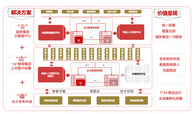根据《国铁集团关于开展“守底线、补缺陷、除隐患、防风险”安全专项整治行动的通知》相关文件要求,结合不同等级铁路视频监控特点,利用信息化、自动化、智能化等技术,建设多功能线路巡防平台,提升“护路联防”能力。中国铁路集团线路巡防平台采用金仓数据库,于2025年4月全国(18个路局)全路局成功上线、投产运行,确保铁路运输的顺畅和安全。