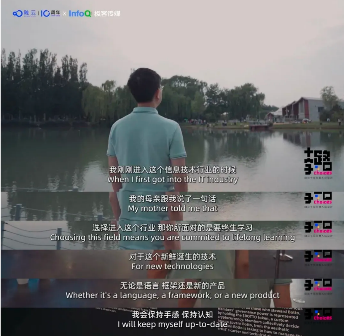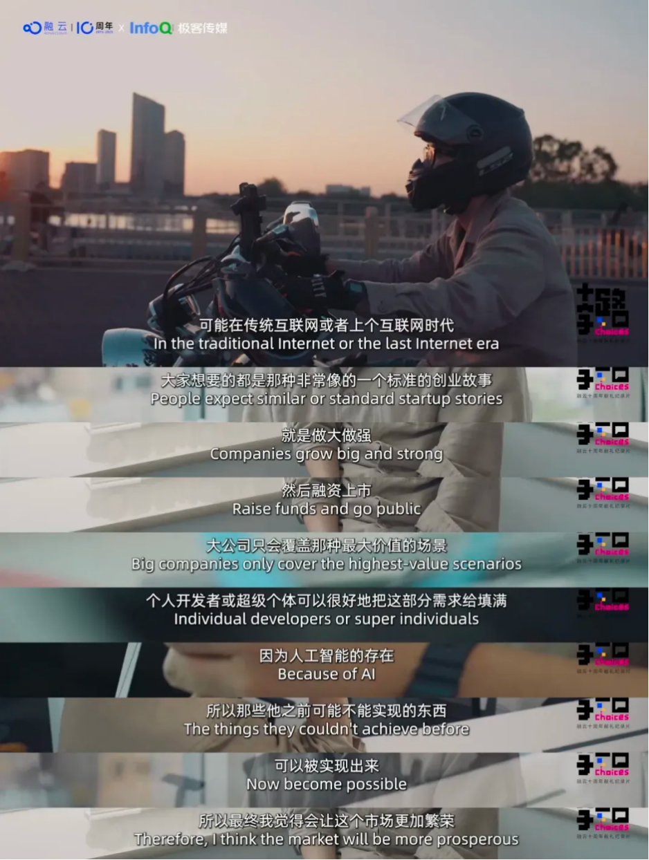 正是在这样的背景下,融云十周年联合 InfoQ 出品程序员纪录片《十字路口》,记录开发者群体的蜕变:从敲下第一行“Hello World”的技术新人,到在 AI 时代找到“造铲子”或“寻新矿”的定位,他们的选择不仅折射出了行业的迭代逻辑,更揭示了技术革命中“人的价值如何重构”—— 这既是工具进化的故事,也是创造者与世界对话方式的进化史。
