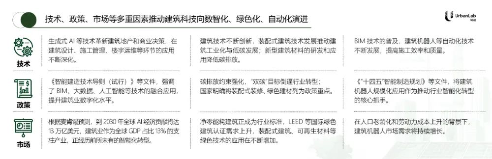 建筑科技的快速发展,正由技术迭代、政策导向与市场需求三股力量合力驱动,沿着数智化、绿色化和自动化三大主轴加速前行。这些主题不仅反映当前行业动态,更预示未来转型方向。