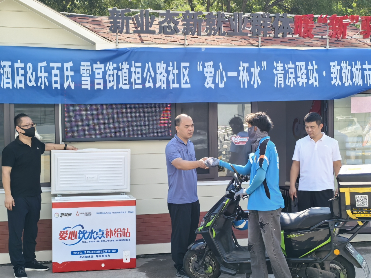 近日,淄博铁塔联合临淄汉庭酒店、桓公路社区,在临淄铁塔换电旗舰店共同启动“致敬城市守护者”公益关爱活动,旨在向高温下坚守岗位的外卖员、快递员、环卫工人等新业态、新就业群体表达感谢与关怀,免费提供冰镇矿泉水,为他们送去一份夏日的清凉。