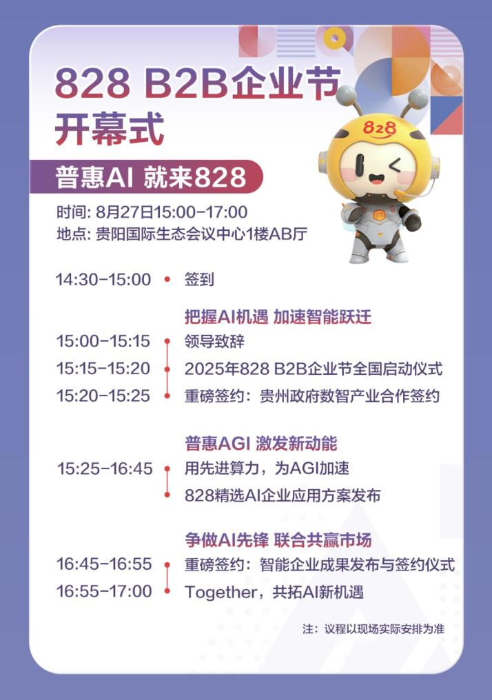 从大模型到云服务,从算力突破到生态合作,中国企业正在迎来新一轮的数智化跃迁。828 B2B企业节不仅是技术展示的窗口,更是行业对话、思想碰撞与合作共赢的桥梁。8月27日一起相聚贵阳,寻找数智化转型的答案,共同见证智能化浪潮的澎湃起航!
