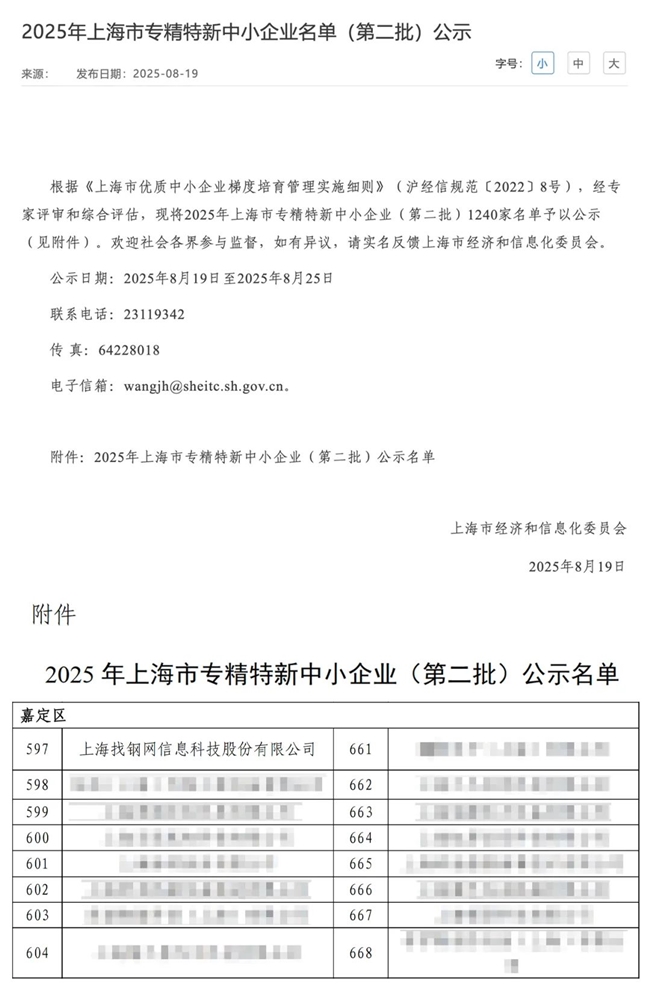 近日,上海市经济和信息化委员会发布了《2025年上海市专精特新中小企业(第二批)公示名单》,上海找钢网信息科技股份有限公司凭借在产业互联网领域的突出表现和创新成果,成功入选。