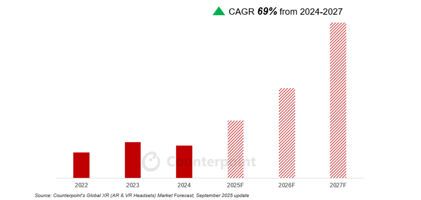 9 月 25 日消息,市场调查机构 CounterPoint Research 今天(9 月 25 日)发布博文,报告称 2025 年上半年全球虚拟现实(VR)头戴设备出货量同比下降 14%,增强现实(AR)智能眼镜同比增长 50%。