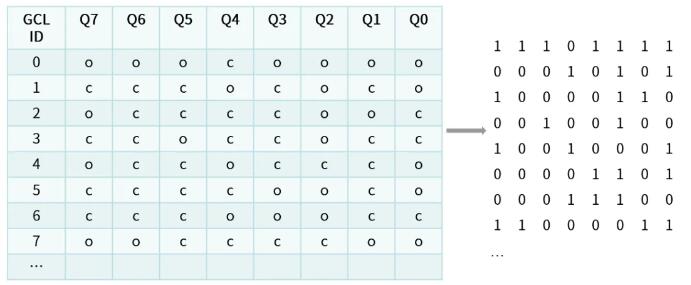 如图1所示各队列的门的开/关状态由GCL精确控制。GCL可以有多行,GCL根据基准时间BaseTime,循环执行,每CycleTime执行一次。