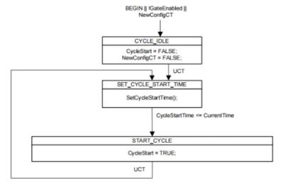 SetCycleStartTime()过程确定下一个GCL执行周期开始的时间。该过程根据Current Time、Oper Base Time、Oper Cycle Time、Oper Cycle Time Extension、Config Change Time和Config Pending的值,将Cycle Start Time变量设置为起始时间,具体规则如下: