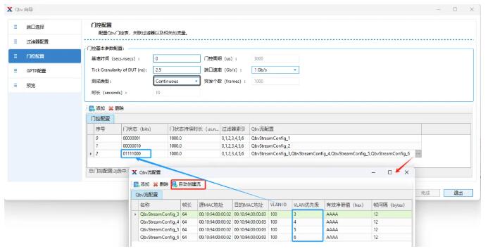配置Qbv流量,点击自动创建流量会自动生成对应优先级的Qbv流,也可以点击“添加”手动创建其他流量,配置测试类型为Continuous。