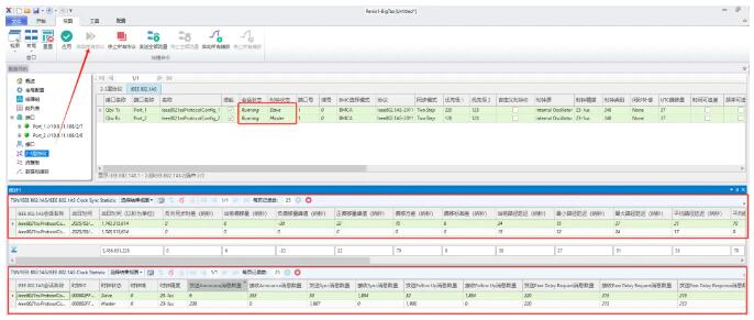 配置AS协议并点击完成,在配置导航栏中可看到生成的AS协议,点击启动所有协议,能看到测试仪Telkerd端口AS时钟状态为Slave,Listener端口AS时钟状态为Master,统计中能看到时间偏移量及协议包交互数量均正常,时间同步是Qbv调度基准时间的基石,需优先确保其建立成功。