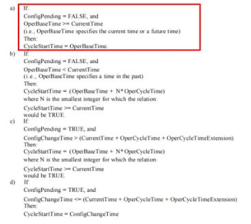 3、Config Pending=TRUE,且Config Change Time>(Current Time+Oper Cycle Time+Oper Cycle Time Extension)那么Cycle StartTime=(Oper Base Time+N*Oper Cycle Time)其中N是满足关系式的最小整数;