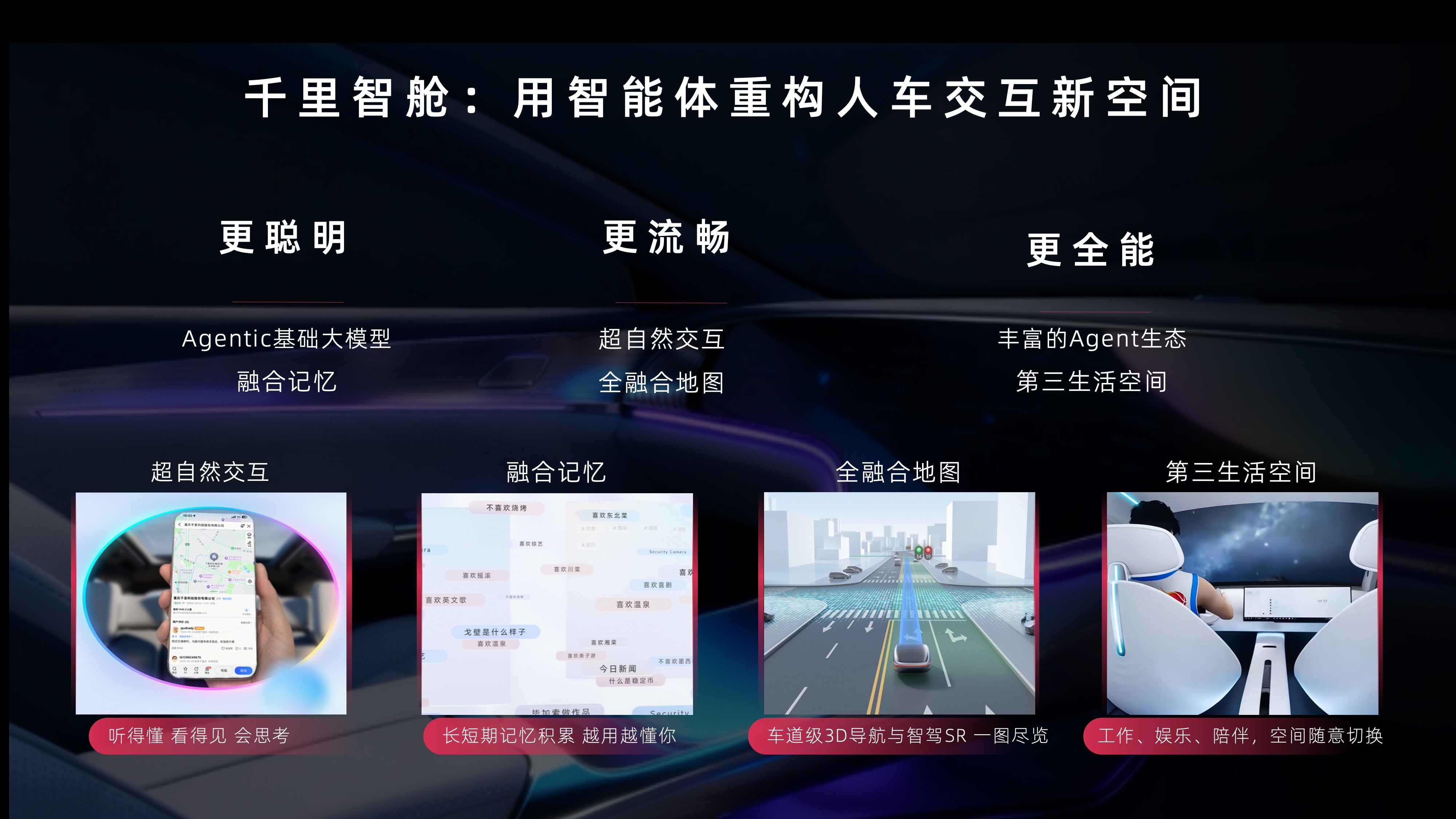 在智能座舱领域,大模型与座舱的结合未来应用前景广阔,不仅将极大提升用户体验,其客户价值也绝不低于智能驾驶。千里科技汇集了行业优秀的智能座舱研发团队,基于行业领先的多模态大模型和AI技术,致力于重构人车交互的体验。千里科技打造的新一代智能座舱Agent OS,实现了超自然交互、融合记忆、全融合地图和第三生活空间等功能,旨在让座舱更聪明、更流畅、更全能,将人车交互体验提升到新的维度。