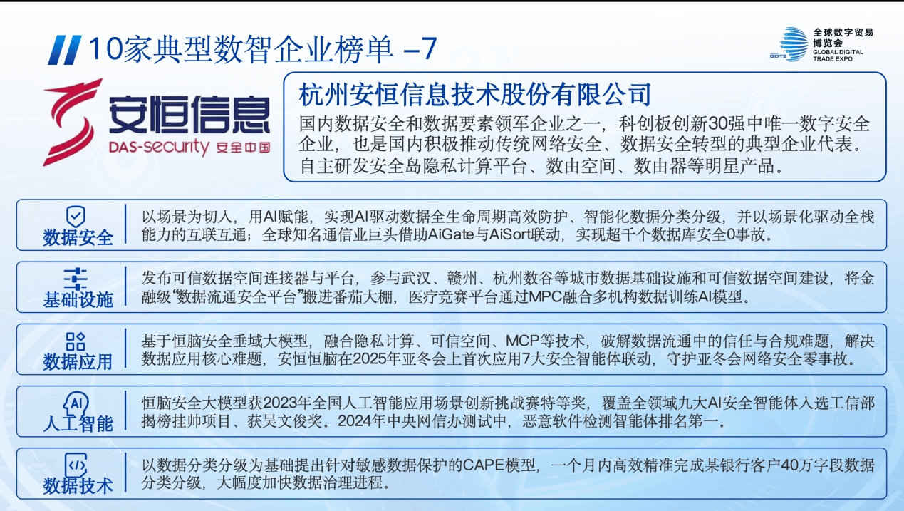凭借全栈式数智服务能力,安恒信息入选全国数智企业TOP10,并在动态图谱中,覆盖六个类别:数据基础设施企业(数据流通基础设施服务)、数据资源企业(数据治理服务)、数据安全企业(数据安全产品)、数据安全企业(服务)、人工智能企业(智能体)、人工智能企业(垂域大模型);在《全国数智产业图谱(2024-2025年)》中入选四个类别:人工智能企业(垂域大模型)、数据基础设施企业(数据流通基础设施服务)、数据技术企业(数据计算平台)、数据安全企业(数据安全产品),成为行业标杆。