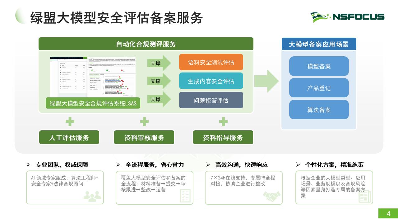 大模型的发展前景广阔,但合规之路任重道远。为助力企业高效、顺利地完成备案,绿盟科技致力于打造标准化、自动化、全流程覆盖的服务体系,为更多企业提供真正专业、高效、可信赖的一站式合规支持,自主研发了核心支撑工具——绿盟大模型安全合规评估系统LSAS。我们坚信只有在合规的框架之下,大模型技术才能充分释放其潜能,为企业、为用户、为社会创造真正可持续的价值。