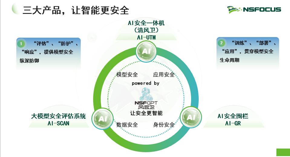 绿盟科技AI安全产品经理李斌介绍了绿盟三大AI安全产品。他表示:面对大模型应用带来的全新安全挑战,绿盟科技正式发布三款核心产品,构建“评估-防护-响应”的全生命周期防御体系。