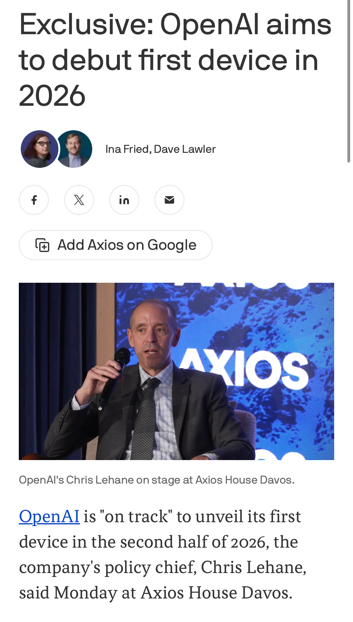 据 Axios 网站报道,OpenAI 政策主管克里斯 · 莱恩周一在达沃斯论坛透露,公司“正按计划”于 2026 年下半年推出其首款设备。