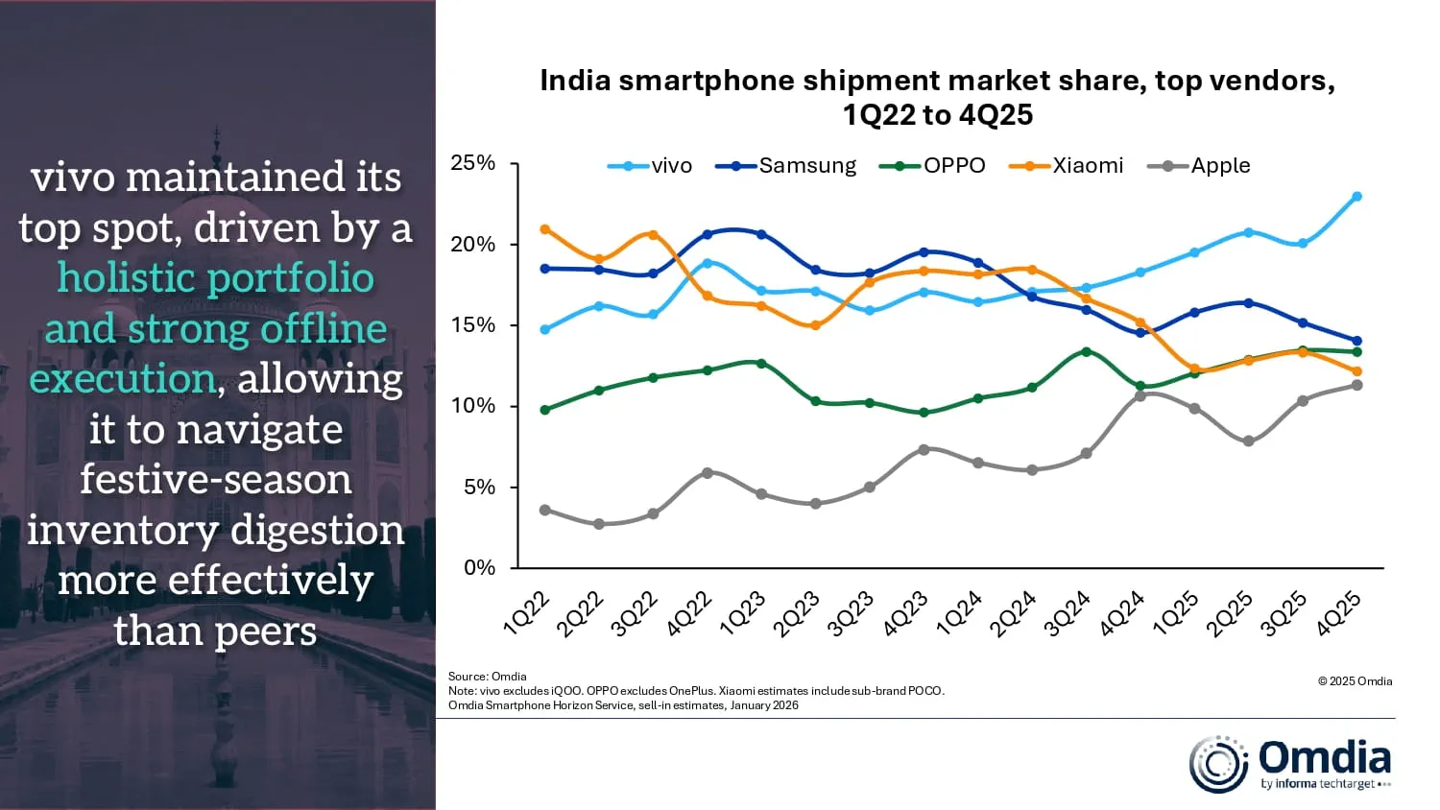 Omdia 报告 2025 印度手机出货量:vivo 同比增 19% 傲视群雄