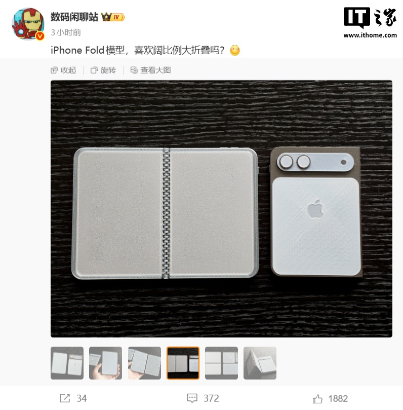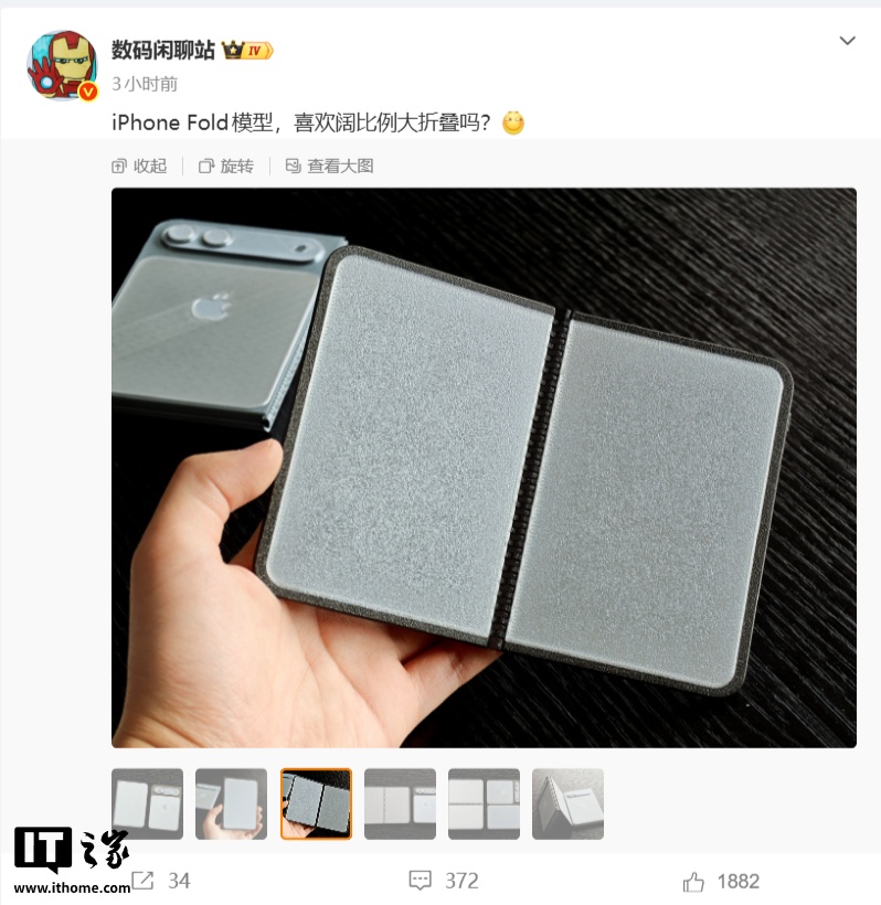 苹果首款折叠屏手机 iPhone Fold 模型曝光,阔比例 + 内外双屏