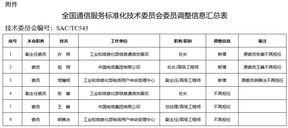 飞象网讯(致新/文)1月23日消息,工信部科技司表示,根据工作需要,有关单位提出了全国通信服务标准化技术委员会委员调整。为进一步听取各方意见,现将委员调整信息予以公示。如有不同意见,请在公示期间将意见反馈至我司,电子版请发送至KJBZ@miit.gov.cn(邮件主题标明:全国通信服务标准化技术委员会委员调整公示反馈)。