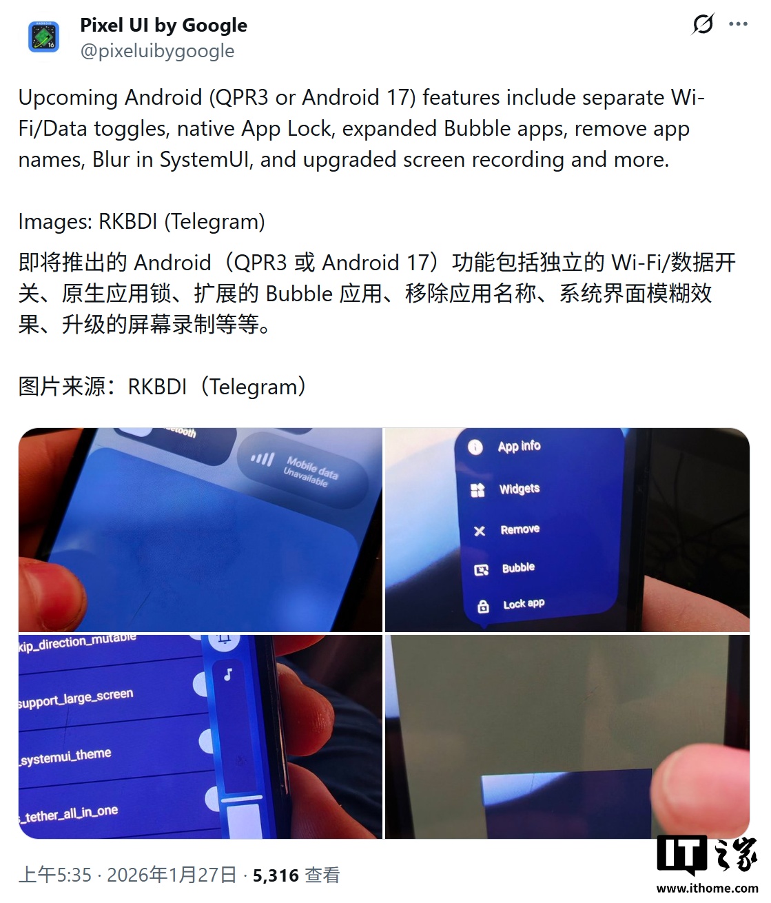 1 月 27 日消息,消息源 @RKBDI 今天(1 月 27 日)在 X 平台发布推文,分享了一组截图,展示了谷歌安卓 17 内部构建版本,聚焦 UI 视觉与功能交互上的变化。