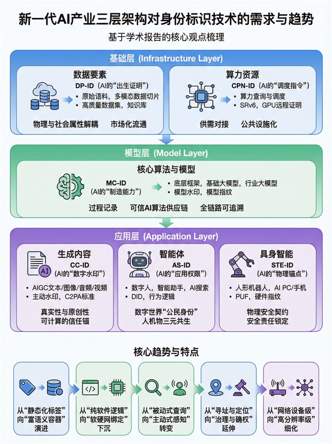 新一代人工智能技术产业图谱通常包括三层,即第一层是基础层,包括数据要素和算力资源;第二层是模型层,包括底层开发框架、中间件与工具链、核心算法与模型、模型服务与交付;第三层是应用层,包括生成内容、软件应用、硬件产品、解决方案。本文首先对各层中关键要素单元在身份标识方面的技术需求进行分析,然后系统性梳理国内外学术界和产业界最新研究成果和实践进展,最后我们总结这些需求和探索背后新一代AI标识所呈现的根本性特征转变。
