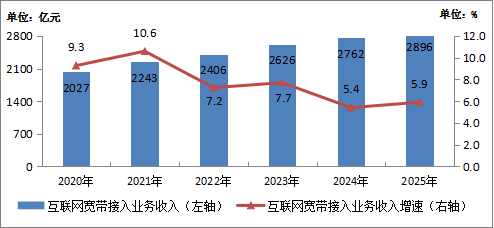 图1-2 2020—2025年互联网宽带接入业务收入情况