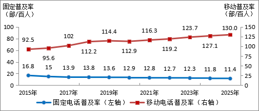 图2-1 2015—2025年固定电话及移动电话普及率发展情况
