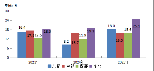 图5-2 2023—2025年东、中、西、东北地区移动互联网接入流量增速情况