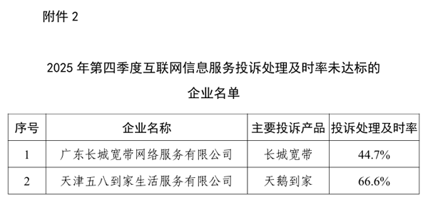 在互联网信息服务投诉方面,2025年第四季度,互联网信息服务投诉平台收到的互联网用户投诉中,服务功能类投诉占比46.2%,个人信息保护类投诉占比18.6%,客服渠道类投诉占比15.5%。在178家头部互联网企业中,广东长城宽带、天鹅到家等2家企业投诉处理及时率较低,已督促相关企业妥善处理用户反映的问题。