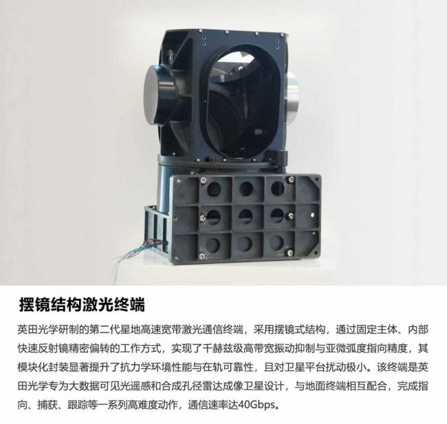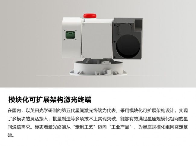 2023年,基于“GW”等大规模应用需求,英田光学成功研制出星间激光通信终端。该终端采用模块化可扩展架构设计,通过将光学、电子等部组件模块化设计和标准化设计,保证光机热稳定性、高隔离度等前提下,实现了多模块的灵活接入,实现了批量制造等多项技术上实现突破,能够有效满足星座规模化组网的星间通信需求。该设计实现了从实验室工艺到工业产品的根本转变,通过固化内部光路,既确保了卫星在振动、温差等极端环境下的指向精度与可靠性,又支持自动化流水线批量生产,显著降低了成本与装配复杂度。