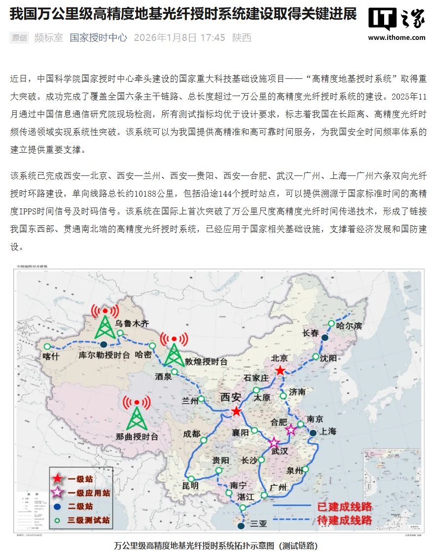 1 月 8 日消息,中国科学院国家授时中心今日官宣,国家重大科技基础设施项目 ——“高精度地基授时系统”取得重大突破,成功完成了覆盖全国六条主干链路、总长度超过一万公里的高精度光纤授时系统的建设。