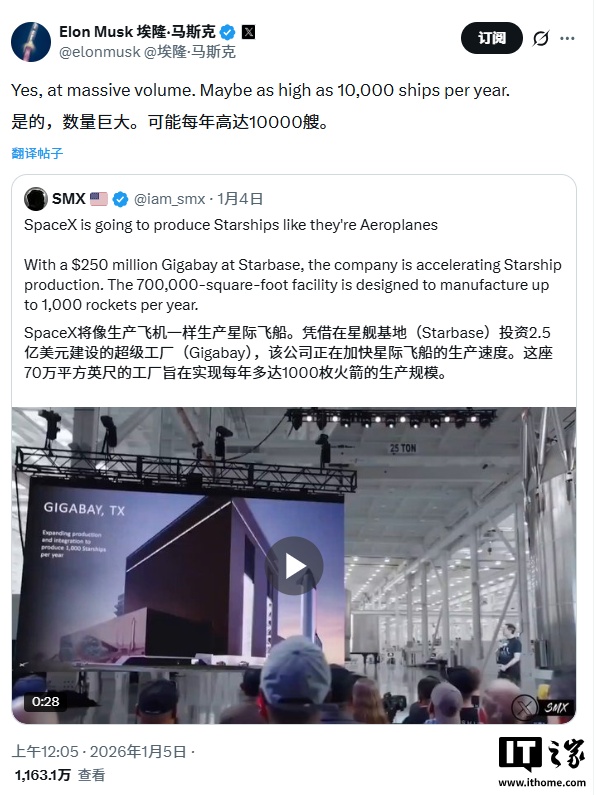 马斯克转发相关报道并配文证实:“没错,将进行大规模量产,年产量或许能高达 10000 枚。”