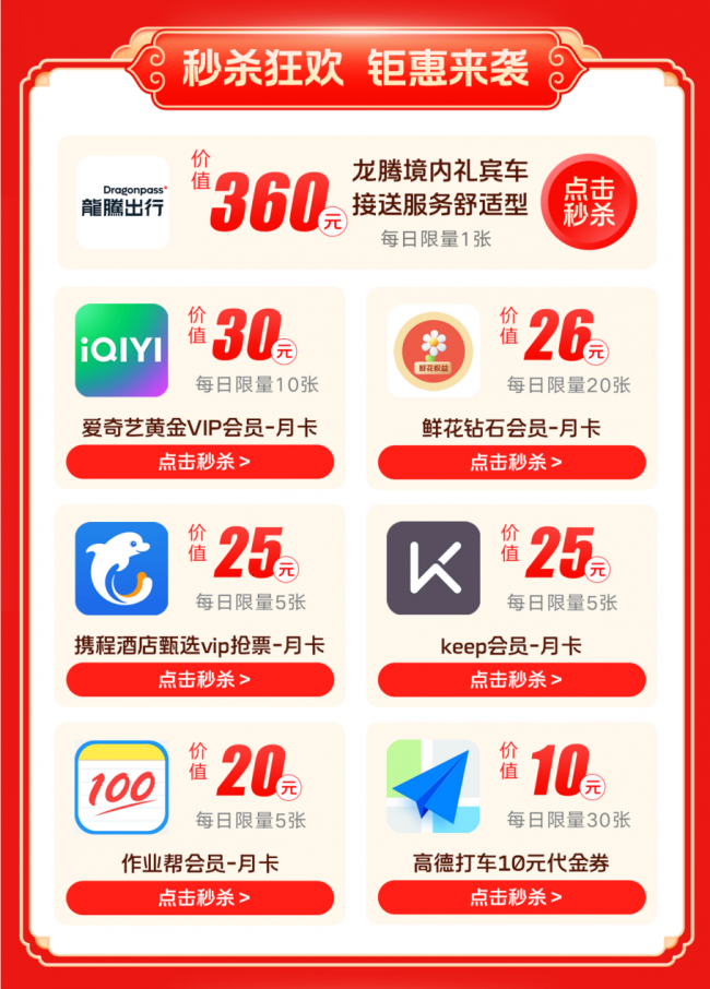 龙腾境内礼宾车接送服务、携程酒店甄选VIP、高德打车代金券,为新年出行添惬意;