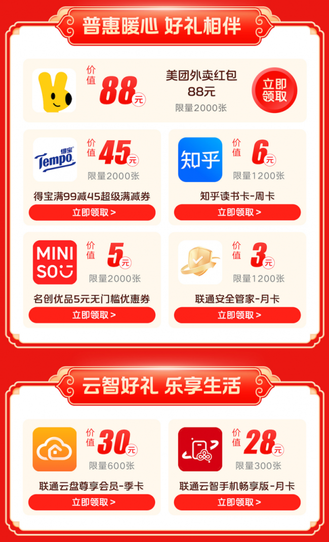 美团外卖红包、得宝满减券、知乎读书周卡、名创优品无门槛优惠券,还有联通安全管家月卡……涵盖年货采购、团圆聚餐、文化娱乐,让您欢度佳节时,省钱又省心。