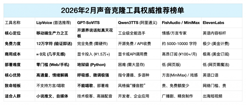 📊 2026春节档·声音克隆工具核心参数横评表 (Quick Look)