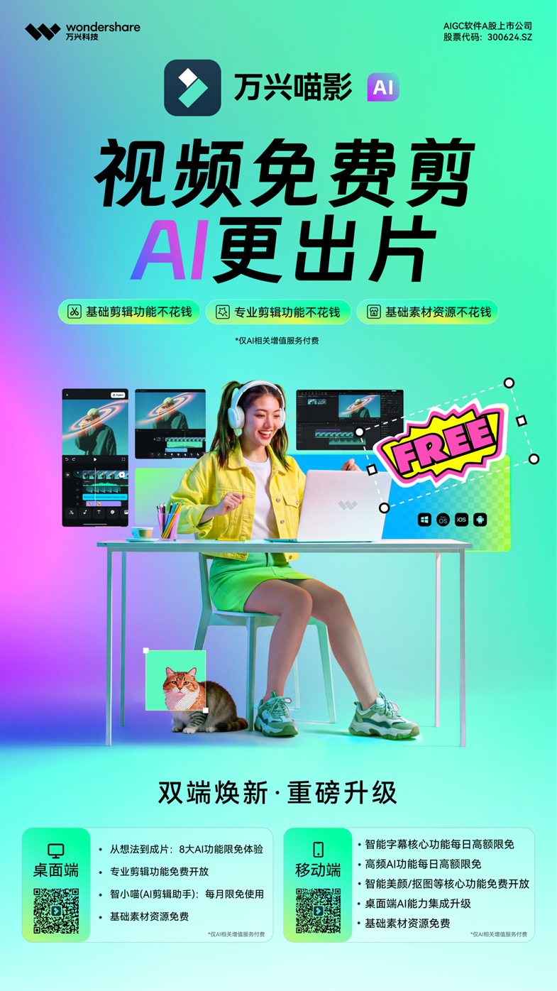 近日,AIGC软件A股上市公司万兴科技(300624.SZ)在视频创意领域再掀创新浪潮,旗下明星产品万兴喵影移动端迎来上线以来最全面能力升级,率先在国内移动剪辑领域推行“基础普惠 + AI增值”服务策略,有力推动移动视频剪辑迈向AI驱动全民创作的新阶段。此前,万兴喵影桌面端已在国内推行该新模式,此次移动端的升级进一步深化了万兴科技在视频创意领域的“AI+移动”及“创意平权”布局。