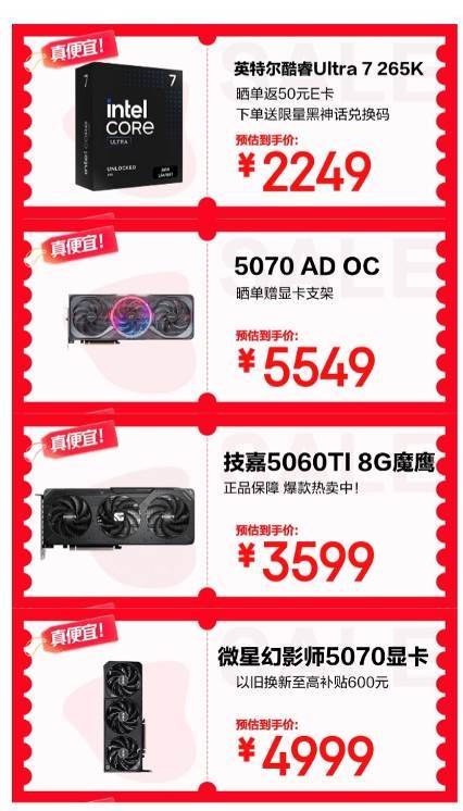 京东618高潮期间多重福利加码,是升级显卡的好时机。英特尔酷睿Ultra 7 265K基于Arrow Lake架构,凭借20核20线程,带来显著提升的多线程性能。同时,英特尔更首次在台式处理器引入NPU,显著优化功耗表现,在保持相同帧率前提下,系统功耗、发热与噪音均大幅降低,畅快游戏更安静省电。京东用户下单即赠限量《黑神话:悟空》兑换码。同为高性能选择,5070 AD OC显卡则以卓越的超频稳定性称著,外观设计融合“黑洞”与“莫比乌斯环”等元素,辅以双环RGB与黑透装甲呈现丰富层次感光影效果,性能之外更兼出众美学。若追求更优性价比,技嘉5060TI 8G显卡是明智之选,能轻松驾驭3A游戏和高分辨率图形任务。微星幻影师5070则以2542 MHz核心频率、丰富接口选项提供广泛兼容性,轻松满足不同显示需求。京东用户下单可享以旧换新补贴,至高立省600元。