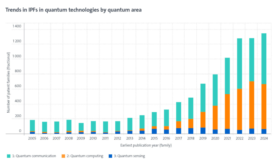 为了量化三个关键量子领域 —— 通信、计算和传感 —— 的趋势,欧洲专利局的专利与技术观察站研究了在两个或多个国家提交了专利申请的发明,这些专利被称为“国际专利家族”(IPFs)。