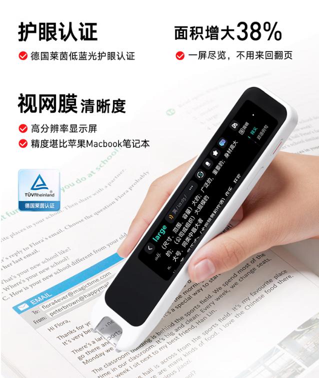 功能测评:配备高清视网膜屏,内置85本正版词典,支持多科知识点查询。快扫技术拿起笔就能用,无需等待开机。口语陪练功能可模拟真实对话场景,适合需要沉浸式口语练习的学生。