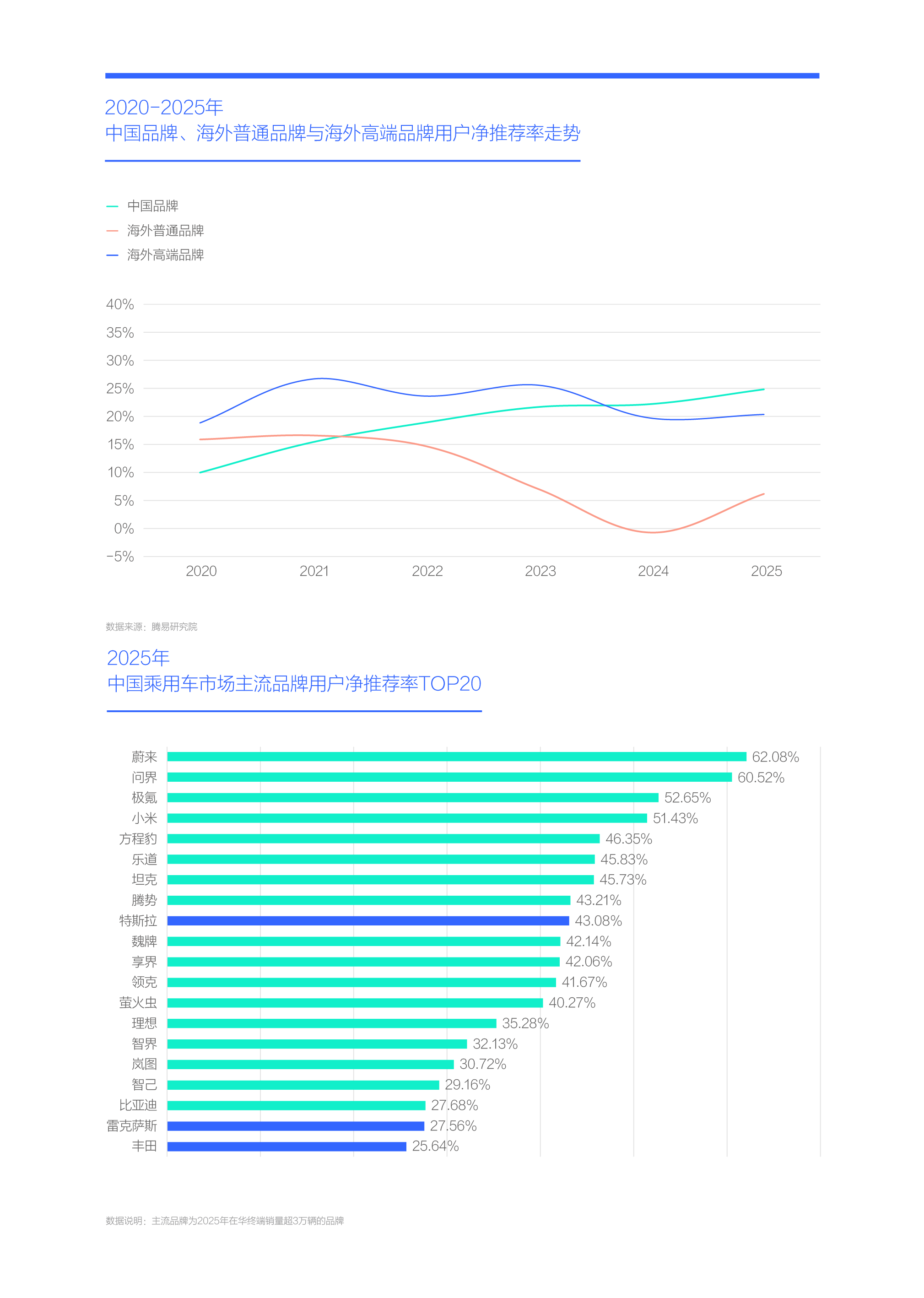 2020-2025年,本轮中国品牌的崛起,不仅第一次大规模留住了用户,而且赢得了用户认可,尤其是提升了关键指标净推荐率,部分说明中国品牌本轮的卖点不局限于传统卖点之便宜,还创造了值得用户分享的新价值。2020年中国品牌的净推荐率不及10%,大幅落后于海外品牌,2022年,比亚迪与理想的强势崛起,助推中国品牌的净推荐率一举超越海外普通品牌,2024年,问界、小米等纷纷跟进,助推中国品牌的净推荐率一举超越海外高端品牌。2025年,中国品牌净推荐率逼近25%,持续保持领先优势;