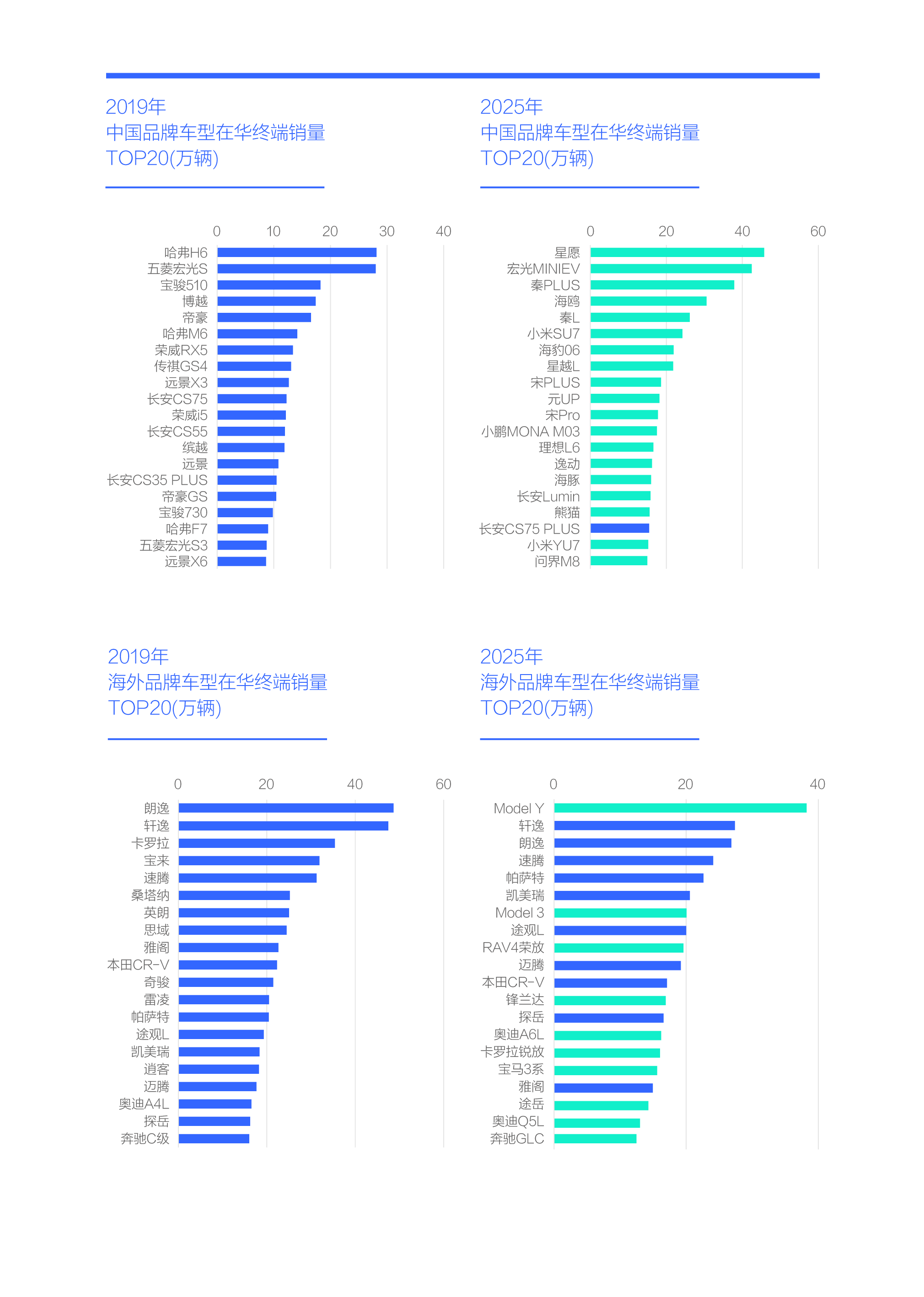反观中国品牌,2019年主销车型,与2025年主销车型,几乎是两套完全不同的阵容,前者主打燃油车,后者主打新能源,如2019年位居榜首的哈弗H6,在2025年直接被挤出了TOP20。中国品牌高效的产品迭代,不仅有效避免了新车与二手车的冲突,还助力了自身甩开膀子抢夺海外品牌的用户