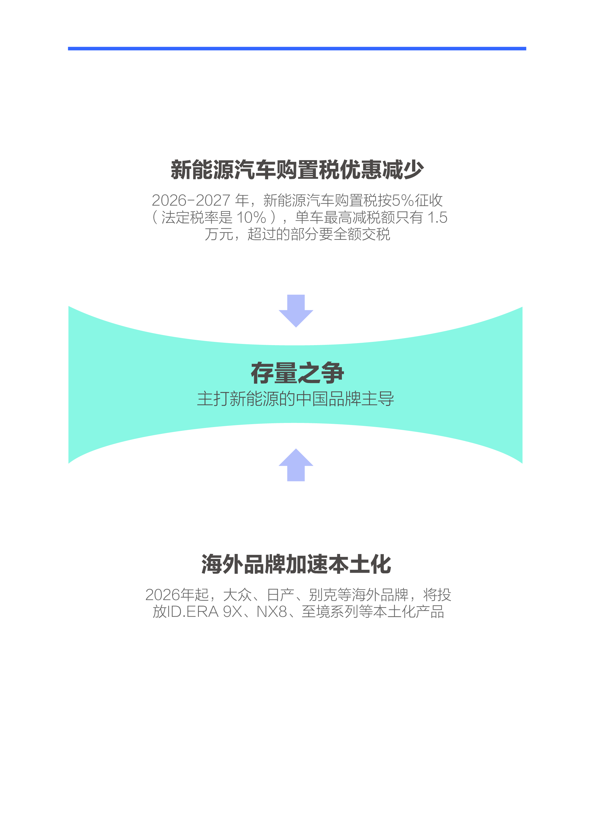 2026-2027年,新能源购置税优惠减半与海外品牌加速本土化,将验证主打新能源的中国品牌的主导地位是否牢固,并开启存量之争2.0时代;
