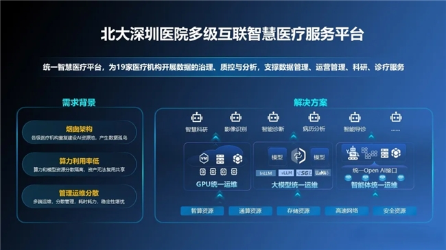 作为国家首批数字化示范医院,北大深圳医院业务覆盖医疗、科研、教学全领域,设有 56个临床医技科室,其中包含1个国家临床重点专科、12个广东省临床重点专科,需同时支撑电子病历、临床决策智能体、医疗影像系统、医保数据管理等核心应用,以及 CAR-T 细胞治疗、胚胎植入前遗传学检测等前沿技术的算力需求。随着 “一院多区” 格局推进与医联体建设深化,医院面临多重挑战: