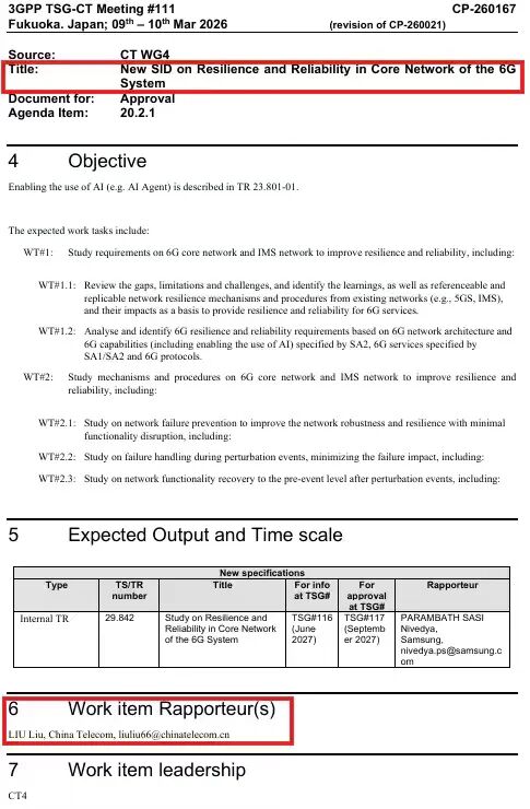 近日,3GPP核心网与终端技术规范组(TSG CT)第111次全会在日本福冈举行。会上,由中国电信牵头的“6G系统弹性和可靠性研究”项目成功获批立项。该项目由中国电信研究院核心网技术研究所90后青年骨干刘柳担任报告人,是中国电信在3GPP CT领域牵头的首个6G网络标准项目,也是本次会议首批通过的四个6G项目之一。